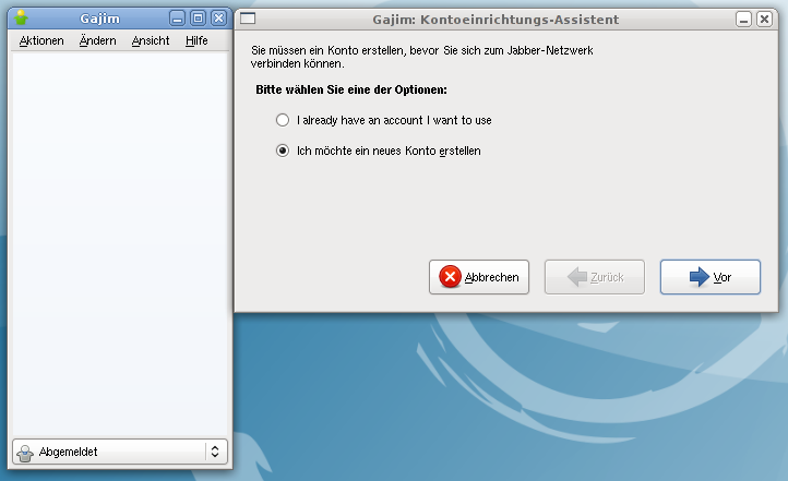 Wenn Gajim das erste Mal gestartet wird, wird dem Benutzer die Frage gestellt, ob ein neues Jabber-Konto erstellt, oder ein vorhandenes verwendet werden soll. Hat man noch kein Jabber-Konto (davon geht dieses HowTo aus), wählt man das Erstellen eines neuen Jabber-Kontos: