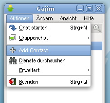 Damit man sehen kann, ob eine andere Person gerade gesprächsbereit ist, oder nicht, muss man die Jabber-ID der jeweiligen Person zu den persönlichen Kontakten hinzufügen 2). Um einen Kontakt mit Hilfe von Gajim zu den persönlichen Kontakten hinzuzufügen wählt man im Menü Aktionen → Add Contact (Kontakt hinzufügen).