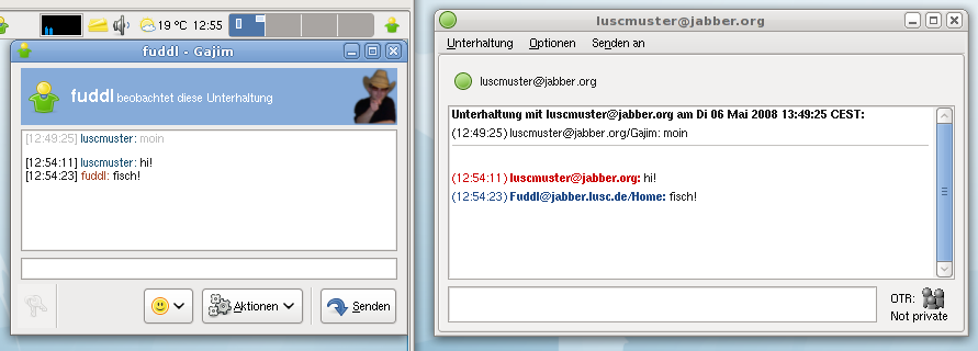 Jabber-Gespräch zwischen Windows (unten, Gajim) und Debian GNU/Linux (oben, Pidgin):