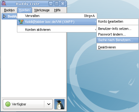 Mit Hilfe des Jabber-Client-Programms Pidgin kann man beispielsweise den Jabber-Server der LUSC nach Jabber-Benutzerkonten durchsuchen.
