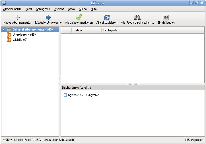 Hat man obige Anweisungen erledigt, erscheinen die letzten Änderungen am LUSC Wiki im Nachrichtenfenster von Liferea: