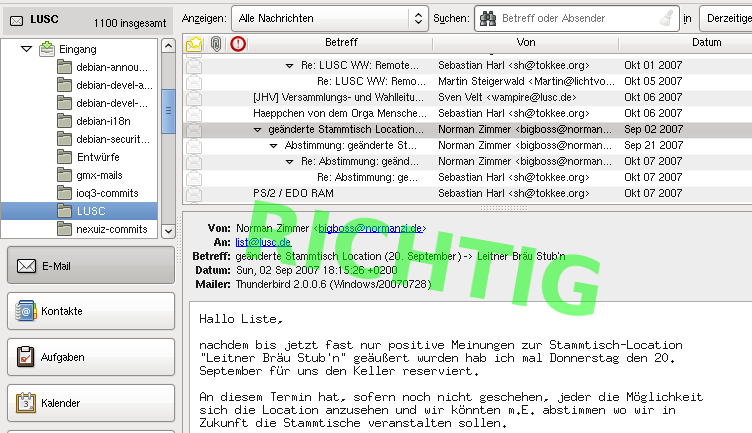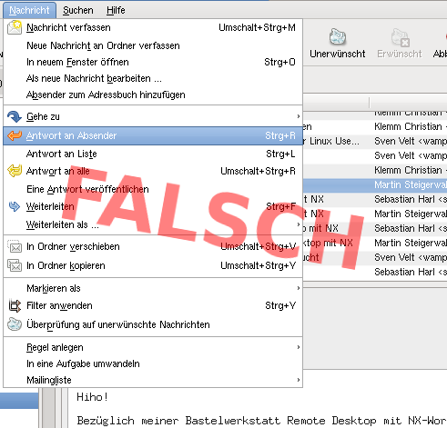 Das E-Mail-Programm Thunderbird bzw. Icedove unter Debian GNU/Linux weist trotz forgeschrittener Versions-Nummern noch immer schwerwiegende Unvollständigkeiten auf! Dazu gehört u.a. das Fehlen einer Funktion Auf eine Nachricht Antworten/Sich an einer Diskussion beteiligen. Dem Nutzer stehen 2 Möglichkeiten der Antwort zur Verfügung: a) „Antworten“ und b) „Allen Antworten“. Bei a) erhält nur der Absender der E-Mail, nicht aber die Liste eine Antwort. Da man bei Diskussionen üblicherweise an die Mailingliste antworten möchte, sollte man „Antworten“ nicht verwenden. Bei b) wird außer der Antwort AN den Absender eine Kopie (CC) an die Liste gesendet. Dies führt zu doppeltem E-Mail-Eingang beim Absender der Ursprungsmail. Wir empfehlen stattdessen ggf. manuell in das AN-Feld die Liste einzutragen und keine Kopie an die Liste oder den Absender zu senden. Falls jemand diese „manuelle“ Adressänderung nicht machen möchte, raten wir von der Nutzung dieser Programme für eine Mailing-Liste ab so lange diese Mängel noch nicht behoben wurden!