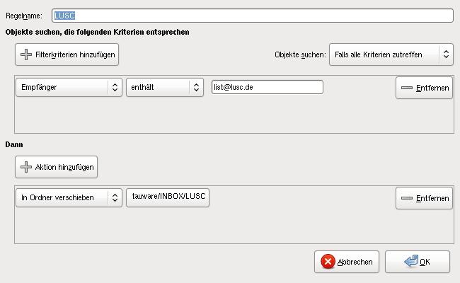 Beispielsweise könnte im E-Mail-Programm „Evolution“ so eine Nachrichten-Filterregel für LUSC-Mailinglisten Nachrichten aussehen: