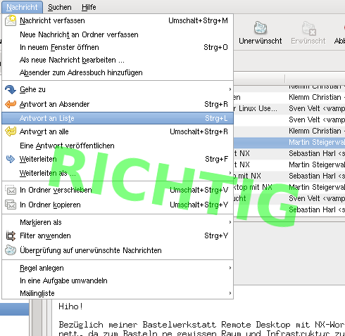 - Wähle in deinem E-Mail-Programm den Antwortmodus „An Liste antworten“, sonst schreibst du versehentlich nur dem Author anstatt der Liste!