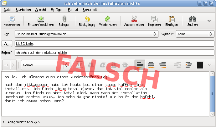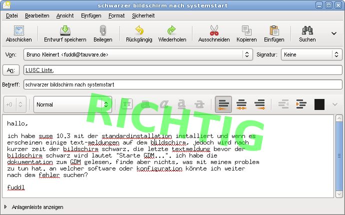 Die Erfahrung hat uns gelehrt, dass Einsteiger den Umgang mit einer Mailingliste als kompliziert empfinden und daher scheuen. Dieses Empfinden kommt in den meisten Fällen daher, dass der Umgang mit einem E-Mail-Programm noch nicht in Fleisch und Blut übergegangen ist oder, dass das verwendete E-Mail-Programm einfach nicht für den Umgang mit einer Mailingliste geeignet ist. Daher wollen wir Dir einen kurzen Leitfaden an die Hand geben.