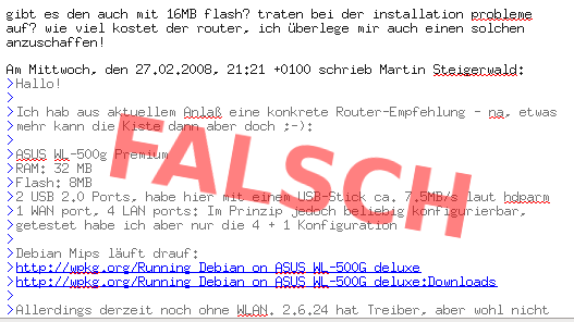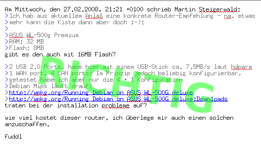 - Antworte dem Lesefluss entsprechend, d.h. was jemand vor dir geschrieben hat steht oben, deine Antwort darunter! Also kein „TOFU“ (Text oben full-quote unten) produzieren, ansonsten kann ein Leser die Gesprächsentwicklung nicht mehr nachvollziehen!