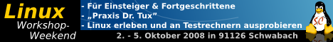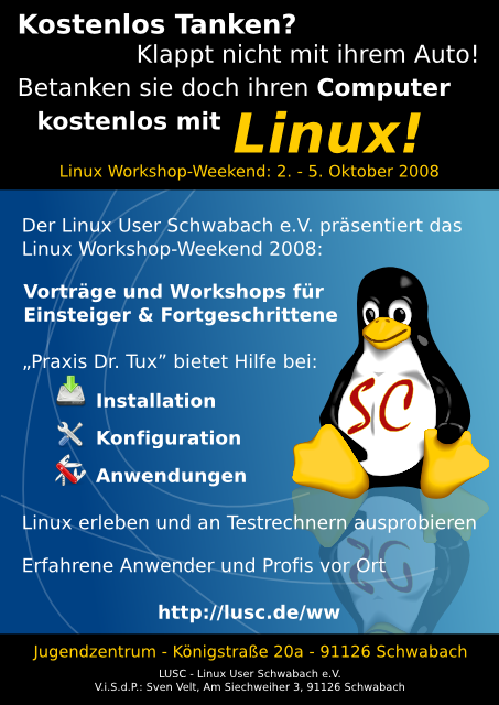 der Linux User Schwabach e.V., kurz LUSC, lädt euch zum LUSC Workshop-Weekend vom 2. bis 5. Oktober 2008 ein! Die Themen der angebotenen Vorträge und Workshops richten sich nicht nur an Linux-Einsteiger, sondern auch an fortgeschrittene und erfahrene Benutzer, die bereits eine erfolgreiche Linux-Installation hinter sich haben und einen Blick nach vorne werfen wollen. Selbstverständlich stehen wir außerhalb des Programms für Fragen rund um Linux mit Rat und Tat zur Seite! Bereitet euch die Installation oder Konfiguration einer Hardware-Komponente Kopfschmerzen, so könnt ihr die Hardware und euren Rechner gerne in unsere „Praxis Dr. Tux“ mitbringen!