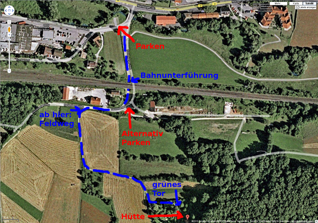 Wegen Platzmangel und um die Zähler für kaputte Rücklichter und stecken gebliebene Fahrzeuge nicht weiter in die Höhe zu treiben, bitte unten einen Parkplatz suchen und den Rest hoch laufen (insbesondere bei feuchter Witterung oder Schnee). Vom Parkplatz (direkt am Fluss) den geteerten Weg durch die Bahnunterführung folgen. Dahinter gleich links sind weitere Parkmöglichkeiten (aber weniger befestigt). Dem Teerweg folgen (90 Grad Rechtskurve), rechter Hand ist der Bauhof. Danach, am ersten Abzweig nach links (Mitte des Bauhofs) in den Feldweg einbiegen. Diesem folgen (erst Linkskurve, dann Rechtskurve). Nach der Rechtskurve den linken Abzweig in Richtung einer Toreinfahrt nehmen. Vor der Toreinfahrt links dem Weg am ersten Grundstück entlang weiter, auf ein grünes Tor zu. Dort habt ihr das richtige Grundstück erreicht.